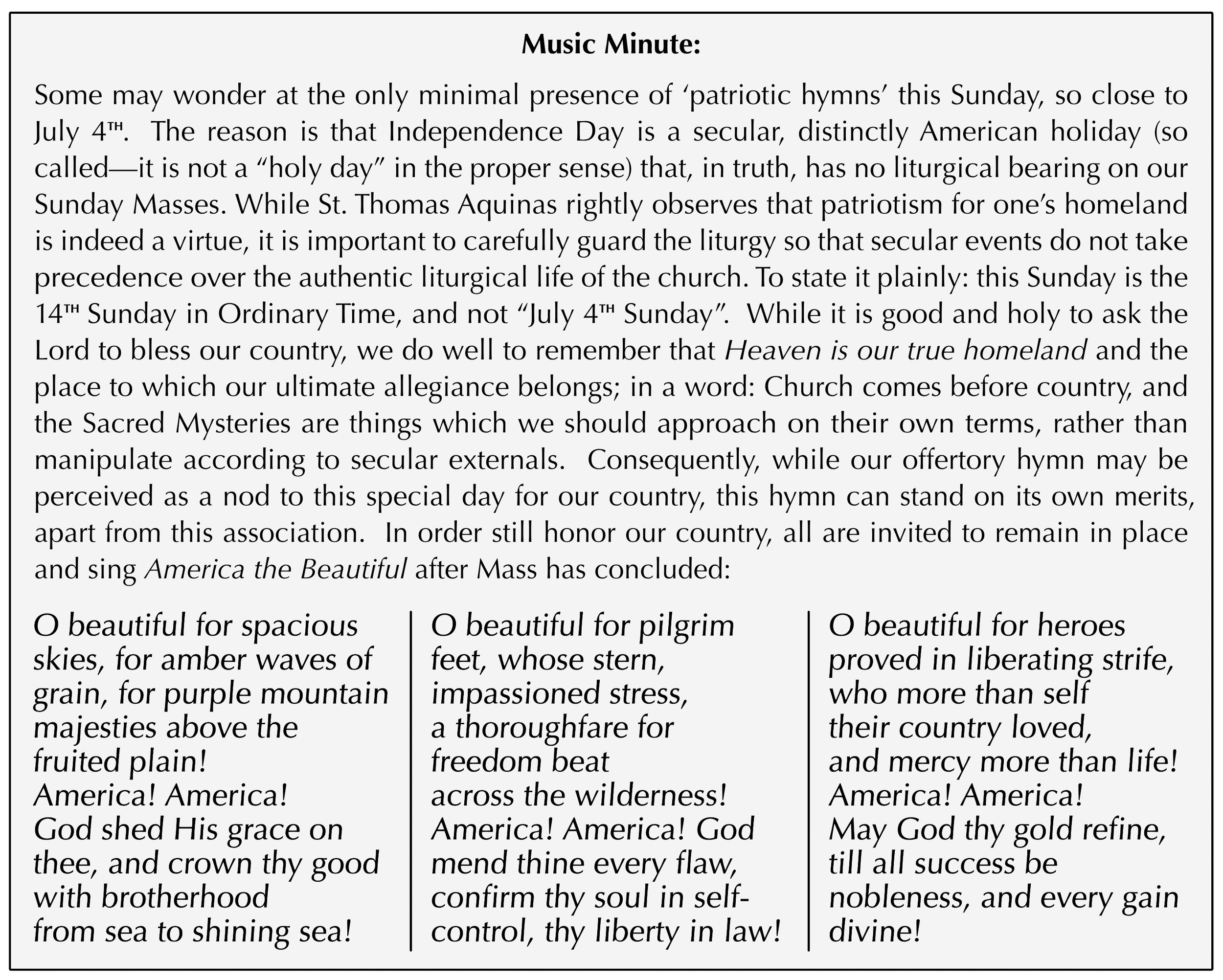 With all of this in mind, I have furnished the follwing “Music Minute” for our parish this weekend, which explains that Mass is “the 14th Sunday in Ordinary Time” and not “July 4th Weekend” whilst still inviting parishioners to remain after Mass to sing America the Beautiful. Being both a prayer and the unofficial-second-national-anthem, this seems an appropriate compromise. We acknowledge and honor our country, without placing the emphasis on it during Mass.