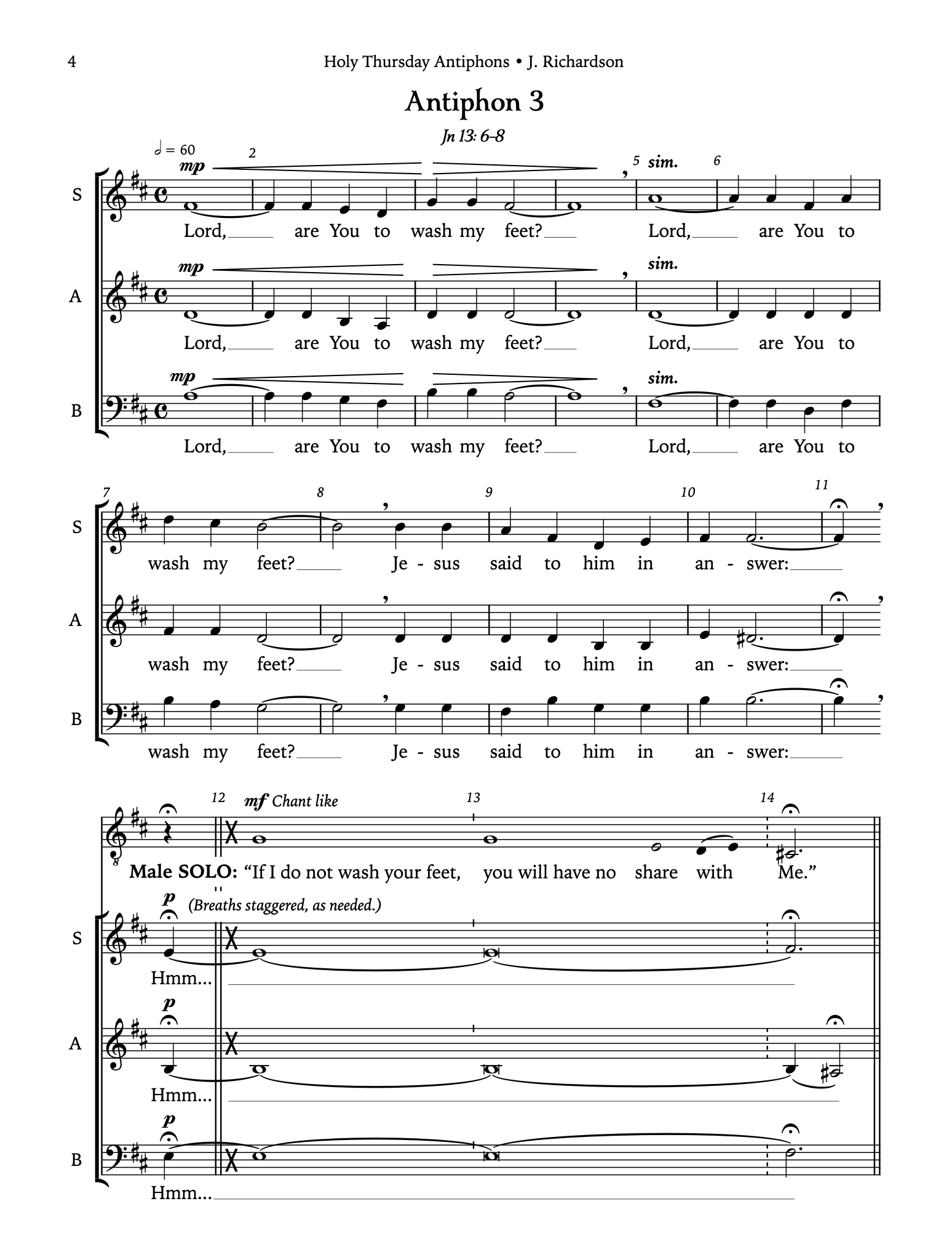 Here are five SAB(ar.) motets which set antiphons 1, 3, 4, 5, & 6 for the ceremony of Foot Washing on Holy Thursday.